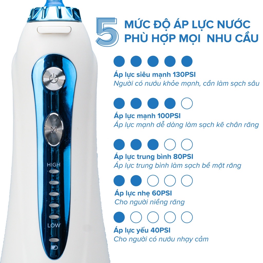 - Máy tăm nước cá nhân TEKKIN HF2 có áp lực nước tùy chỉnh từ 40 - 130 PSI ở 5 chế độ tia nước từ nhẹ tới mạnh sẽ phù hợp sử dụng vệ sinh răng miệng cho cả răng em bé, răng nhạy cảm của mẹ bầu và cả răng yếu mỏng manh của người lớn tuổi.